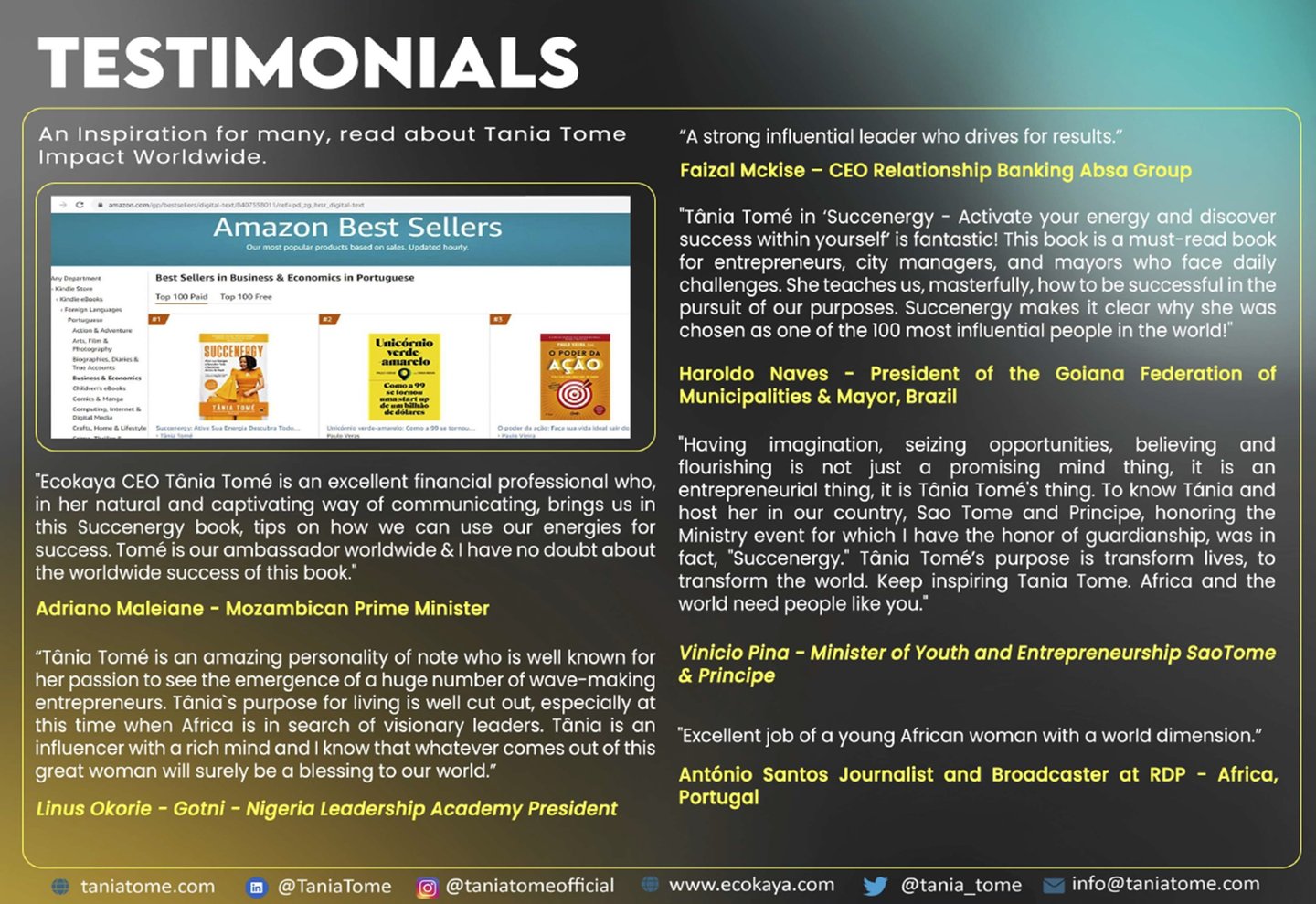 “Ecokaya CEO Tania Tomé is an excellent financial professional, captivating communicator and a ambassador worldwide. I have no doubt about the worldwide success of the ‘Succenergy’ training book.”
